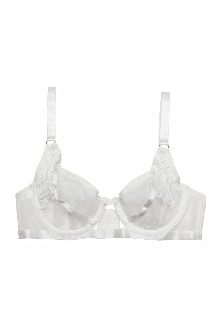 Elevate the everyday. The Milana Ivory bra features a non-padded mesh cup finished with a delicate lace overlay. Pair with the matching suspender thong to complete the look.