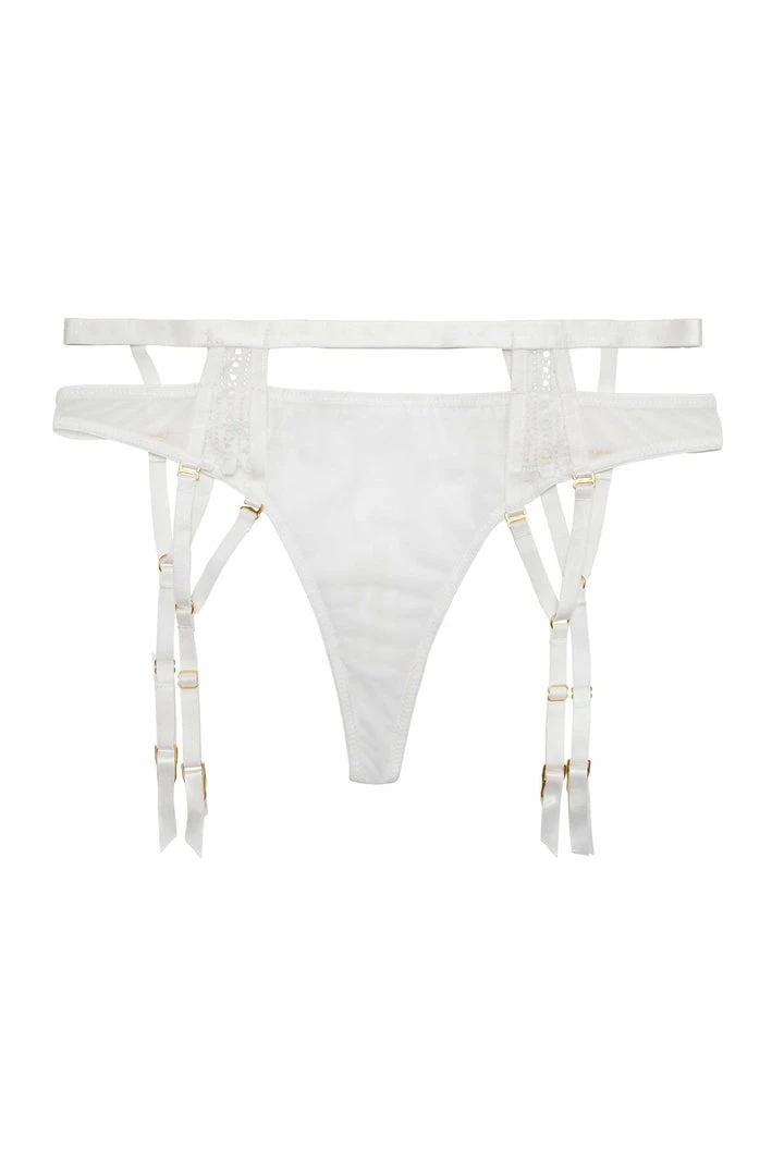 Elevate the everyday. The Milana Ivory thong features a mesh base, suspender straps with gold hardware finished with delicate lace. Pair with the matching bra to complete the look.