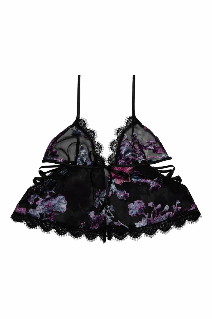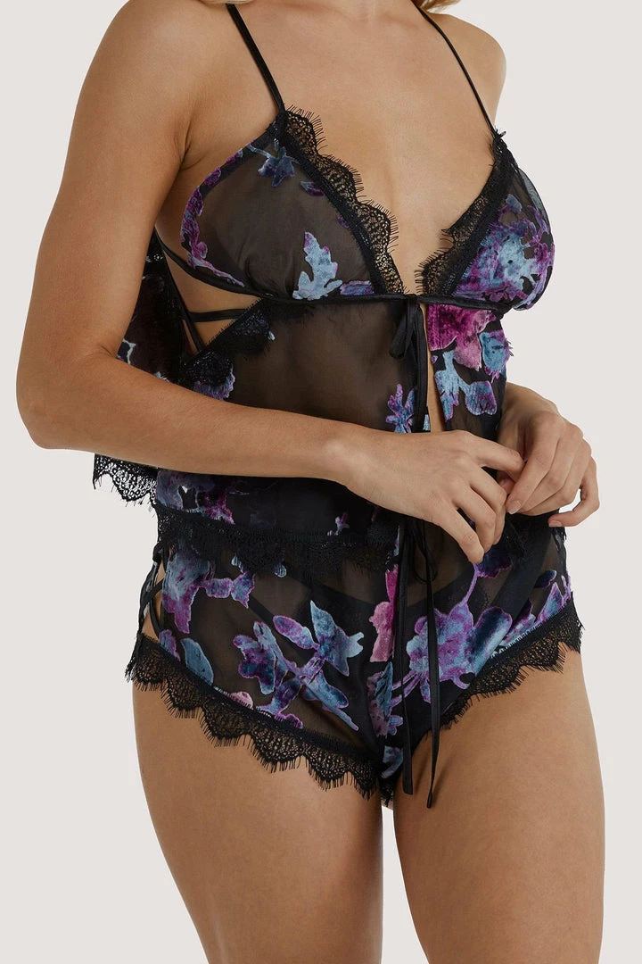 The ultimate PJ set for Spring! Sheer floral devore is paired with seductive cut-outs and a lace trim.