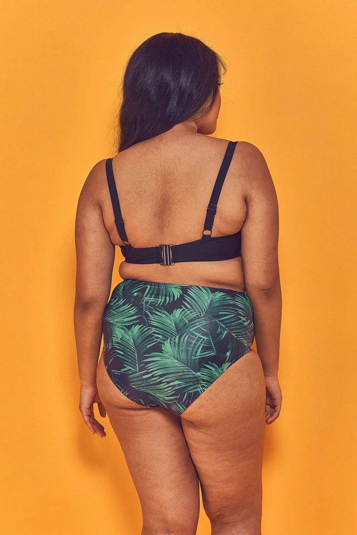 - Tropical print, with black contrast panel at the bridge.