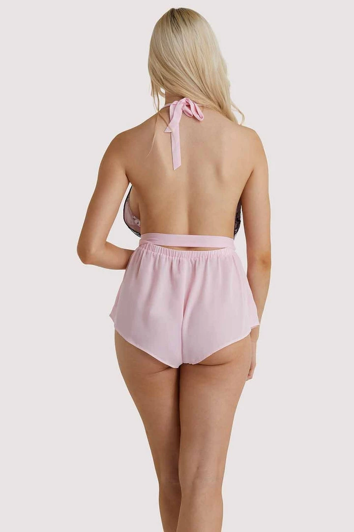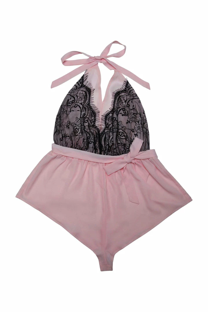 Who says nightwear can’t be sexy? Slip into something sumptuous with our gorgeous Suzie. Blush pink playsuit featuring contrast lace, along with a plunging neckline and tie up halter neck. Perfect for a romantic night in.