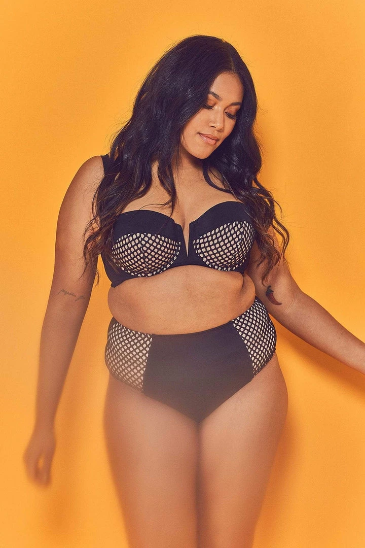 The Cyra high waist brief has contrasting side panels composed of beige overlain with black fishnet. It’s perfect for mixing and matching with your favourite bikini top!