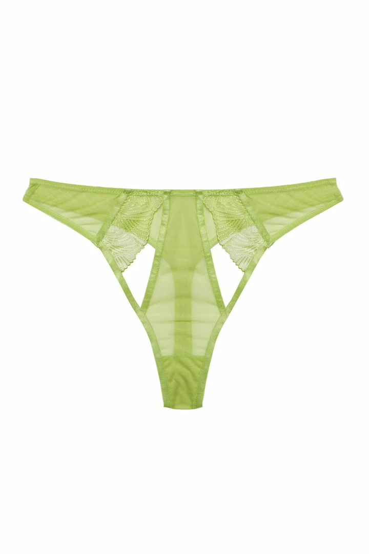 Feel mythical in our Taha Green Cut out thong. This beautiful soft green brief is made from a large floral lace and mesh, it features cut out details at the front and cheeky thong finish at the back. Match with our Taha Bra and Suspender Skirt for the lingerie set of dreams.